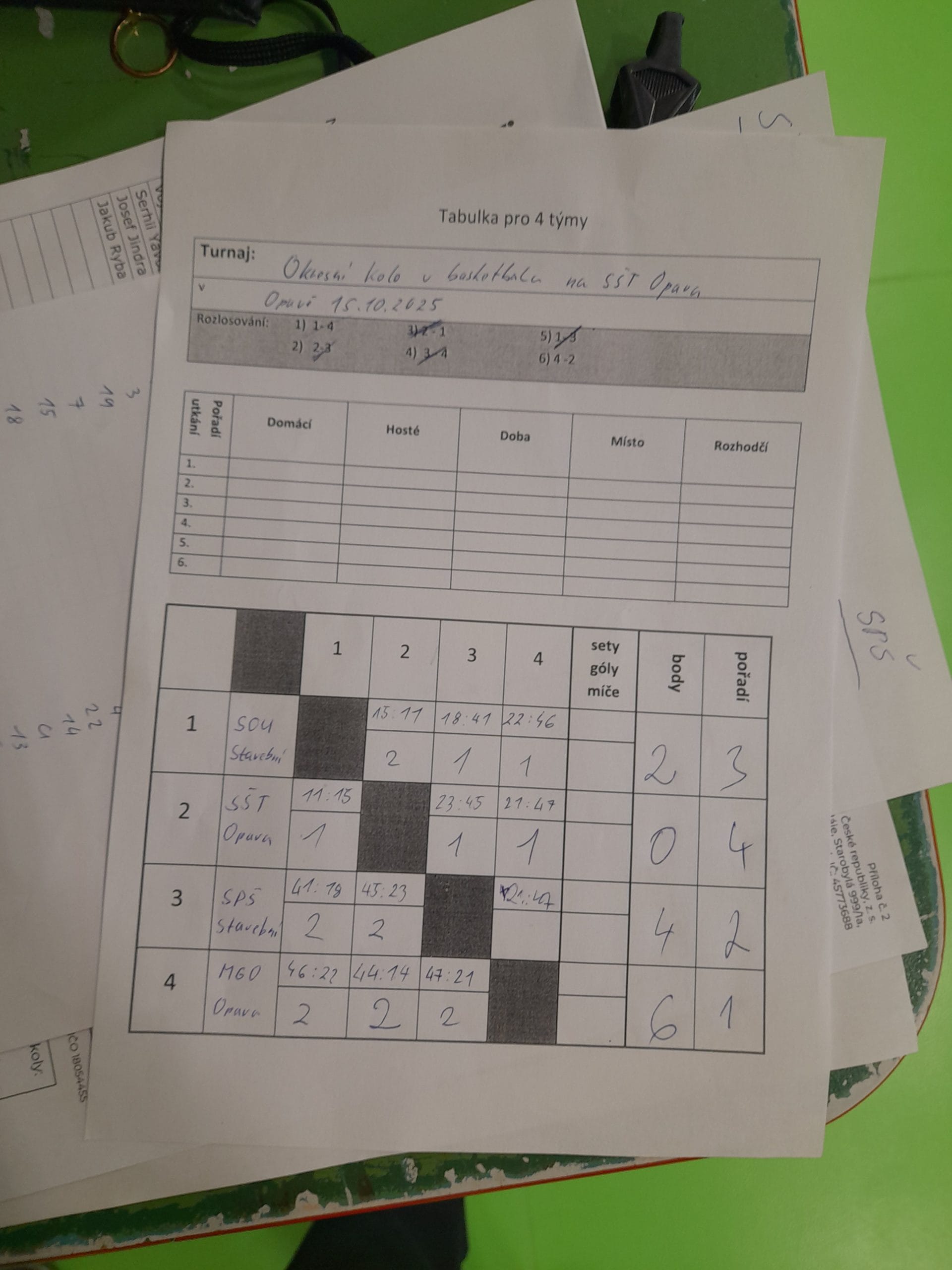 Do letošního okresního kola v basketbale naše škola vyslala tým složený z 9 hráčů. Dnes již žádný z nich není aktivním hráčem basketbalu, což pro ostatní týmy neplatilo. Na hře to ale patrné moc nebylo. Porazili jsme domácí tým ze SŠT a poločas jsme byli vyrovnaným týmem pro SŠ stavební. Trochu za slabší konec jsme táhli jen proti vítězi naší skupiny, týmu Mendelova gymnázia.